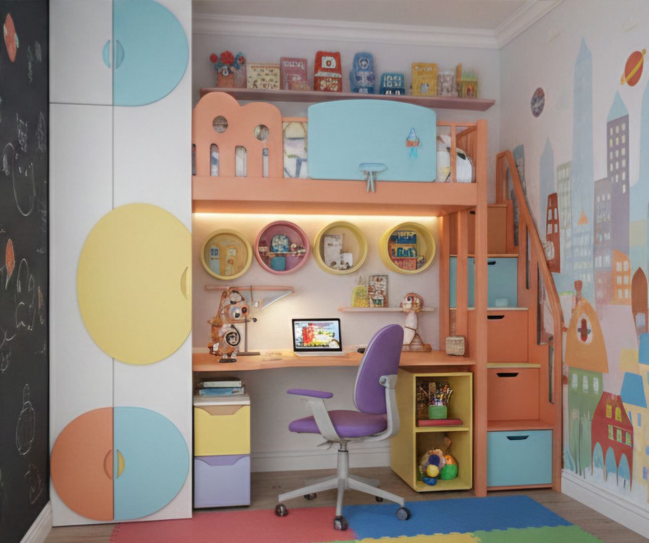 - Эргономичный рабочий стол с регулируемым креслом — удобная зона для учёбы и творчества.