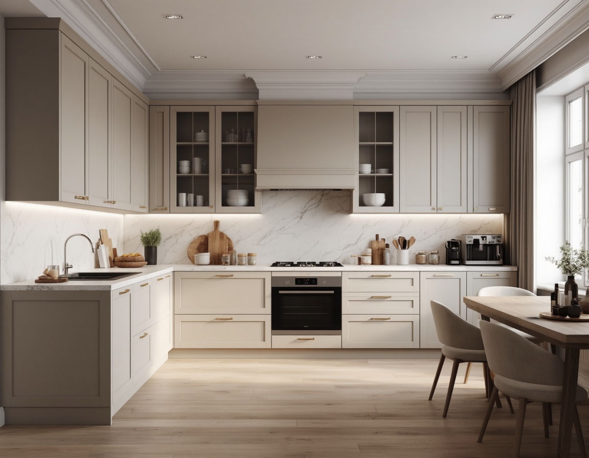 «Неоклассическая симфония» — элегантный мебельный комплекс для кухни, сочетающий утончённость неоклассики с практичностью современного дизайна. Этот интерьер превращает кухню в центр домашнего уюта, где каждая деталь продумана для комфорта и эстетического наслаждения.