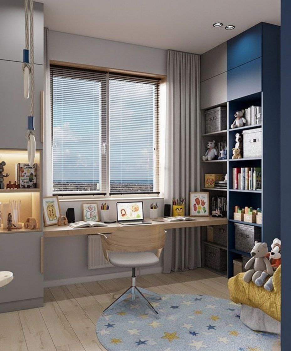 Максимальное естественное освещение — стол-подоконник у окна снижает нагрузку на глаза и повышает продуктивность. Умная организация пространства — всё под рукой: открытые стеллажи, закрытые ящики, ниши для канцелярии. Рост вместе с ребёнком — эргономичный стул с регулировкой высоты и ортопедической спинкой. Безопасность на первом месте — скруглённые углы, гипоаллергенные материалы. Индивидуальный стиль — дополните дизайн постерами, фигурками или цветными коробками по вкусу ребёнка!