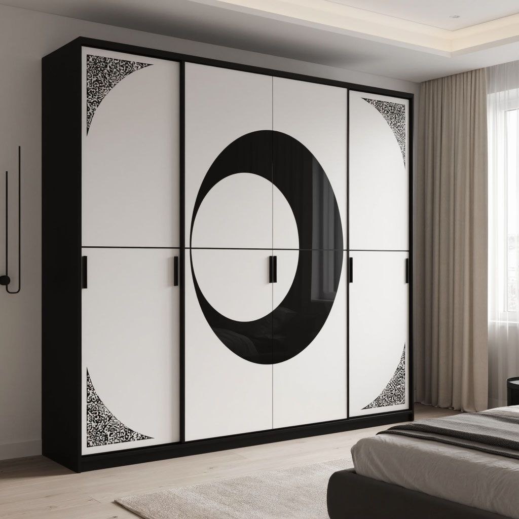 - Контрастная чёрно-белая гамма — фасады шкафа оформлены в драматичном сочетании чёрного и белого, что создаёт эффект глубины и подчёркивает современный стиль. Центральный элемент в виде чёрного круга напоминает луну, придавая дизайну художественную выразительность.